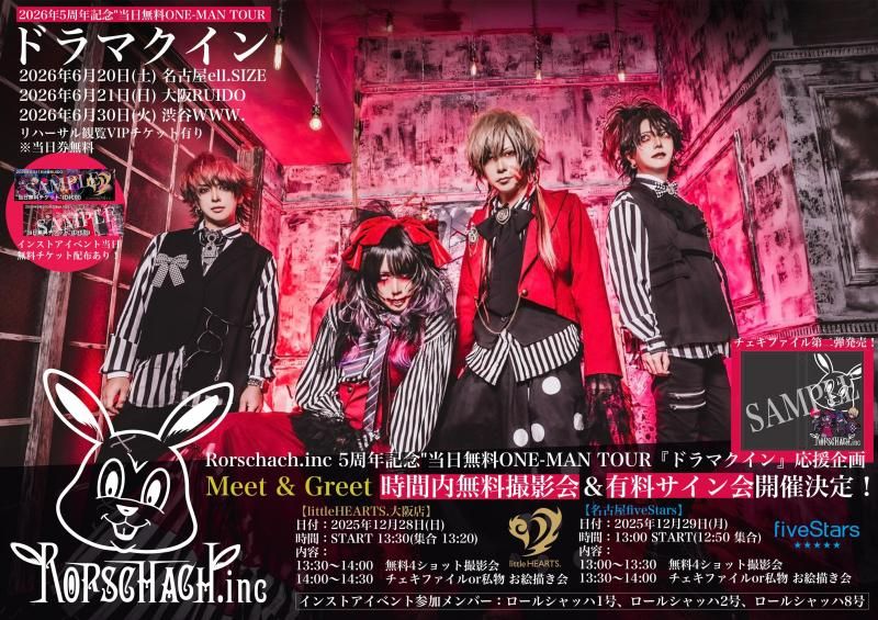 Rorschach.inc 5周年記念"当日無料ONE-MAN TOUR『ドラマクイン』応援企画 Meet & Greet 時間内無料撮影会&有料サイン会開催決定!!